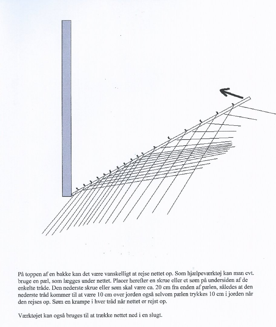 Hegnet skal monteres på indersiden af liniepælene. Fra den nederste tråd til jorden må der maksimalt være 10 cm. Fra den øverste tråd til pæletoppen skal der være mindst 5 cm.